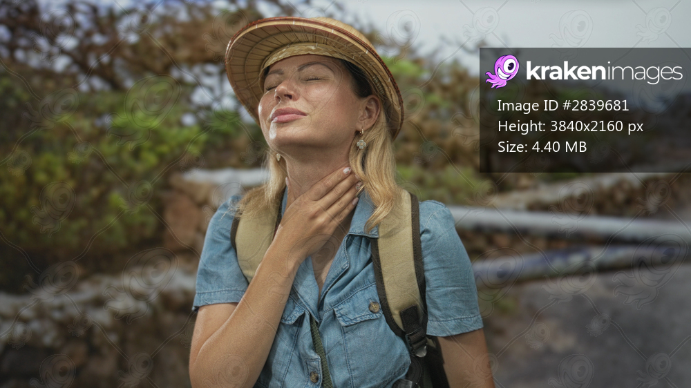 A young blonde explorer woman in a hat clutching her throat and covering her mouth while standing on a green forest trail; discomfort.