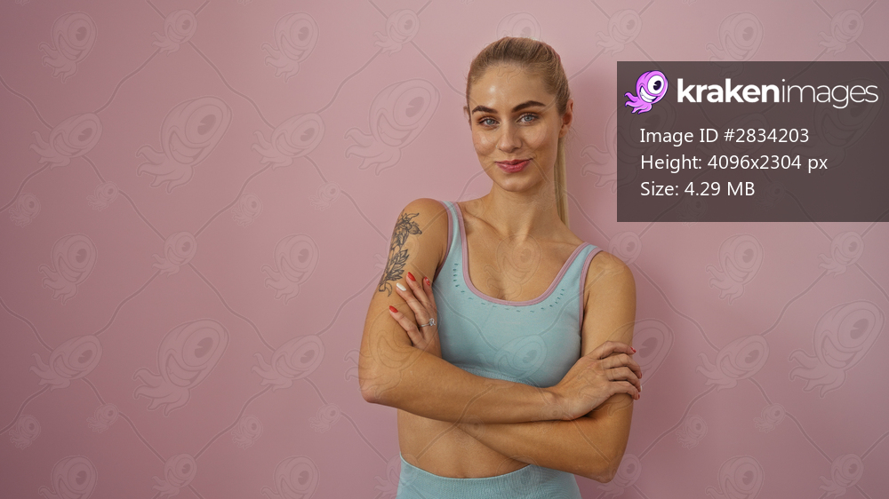 Adult attractive blonde caucasian woman crossing her bare arms with a slight smile in a bright pink studio setting; confidence.
