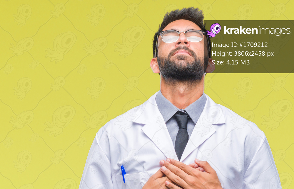 Adult hispanic scientist or doctor man wearing white coat over isolated background smiling with hands on chest with closed eyes and grateful gesture on face. Health concept. - Kraken Images