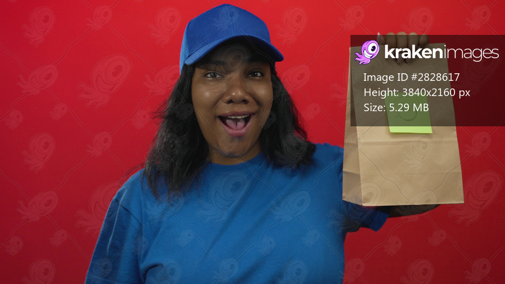 African american courier woman smiling holds paper bag in red studio with blue cap and uniform; friendly service.