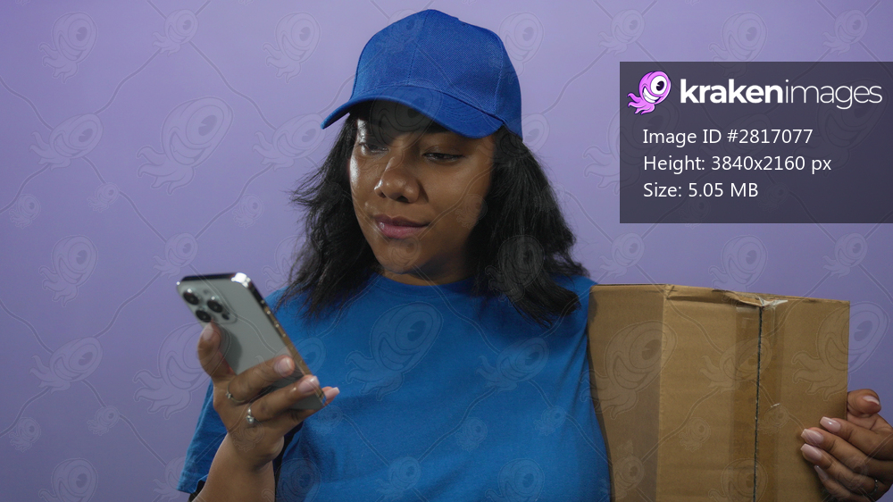 African american delivery woman holds smartphone while gripping cardboard package in purple studio; service confidence.