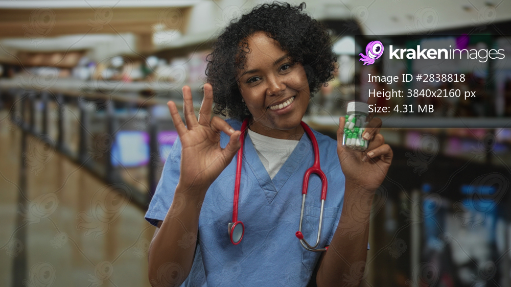 African american doctor holding pills and making ok sign in bright building; trust health confidence.