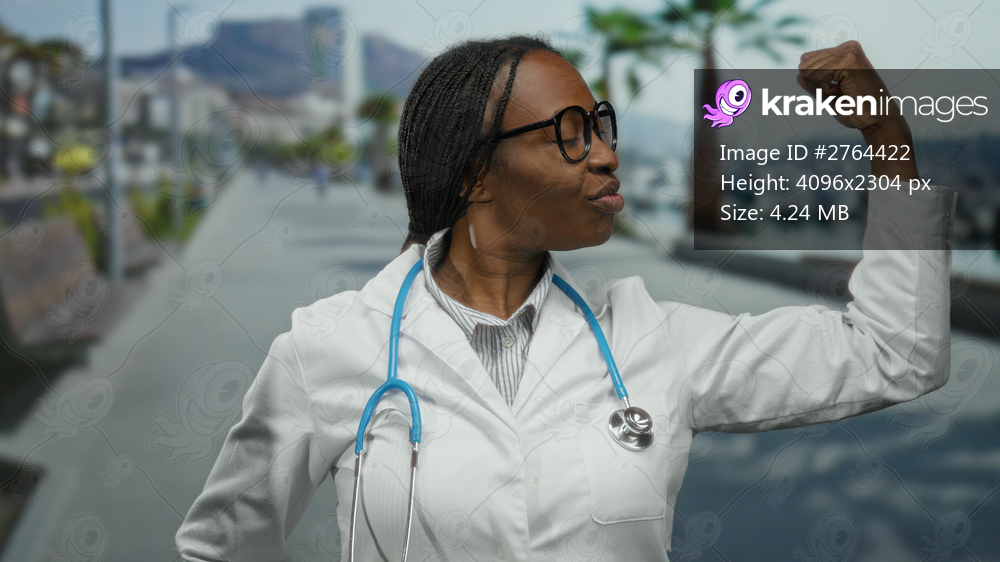 African american female doctor wearing white coat and glasses stands confidently with stethoscope on seaside promenade showcasing professionalism and empowerment. - Kraken Images