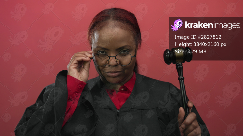 African american judge in black robe adjusts glasses while holding wooden gavel in red studio; authority confidence.