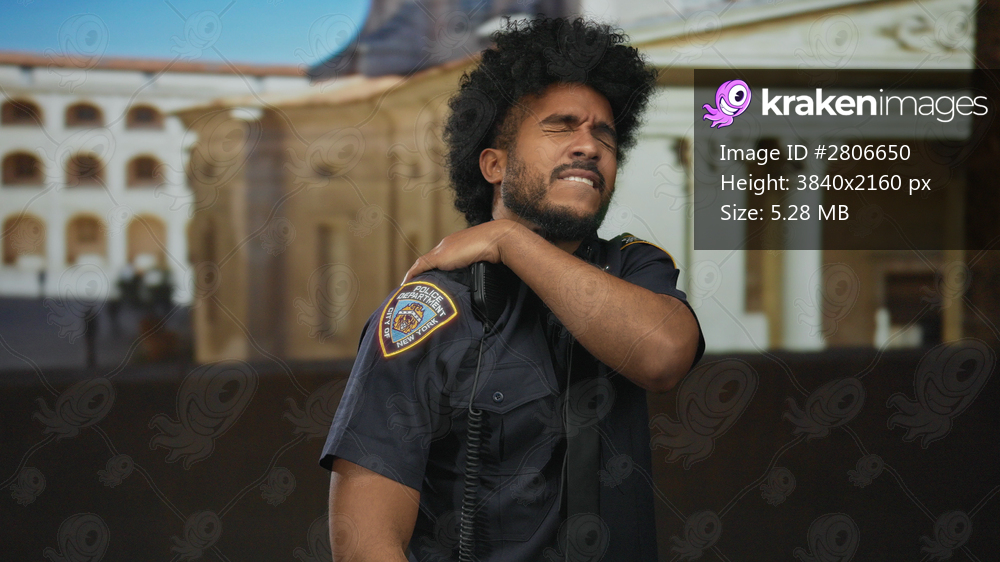 African american male police officer in uniform outdoors with a pained expression showing shoulder injury against an urban backdrop.