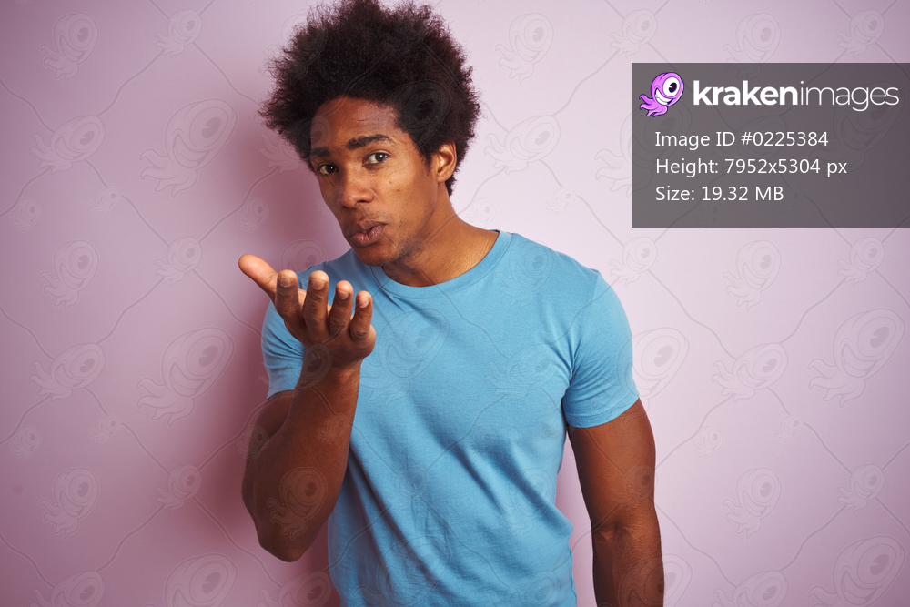 African american man with afro hair wearing blue t-shirt standing over isolated pink background looking at the camera blowing a kiss with hand on air being lovely and sexy. Love expression. - Kraken Images