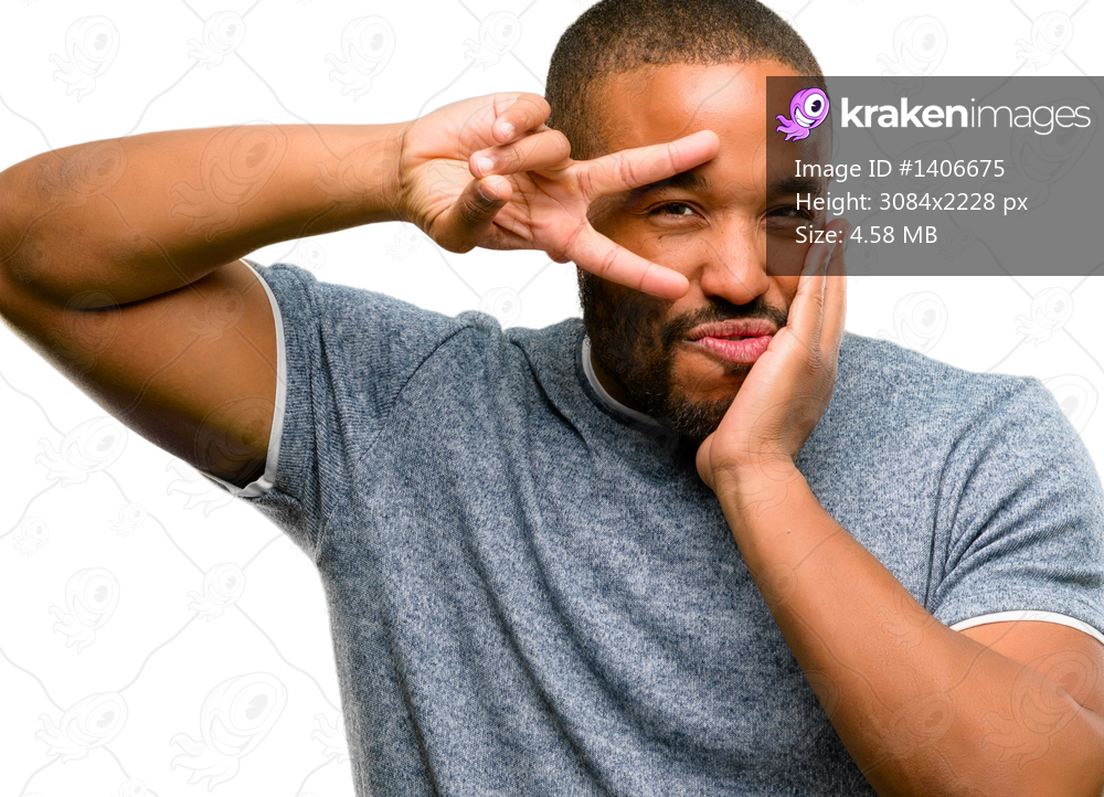 African american man with beard looking at camera through fingers in victory gesture winking the eye and blowing a kiss isolated over white background
