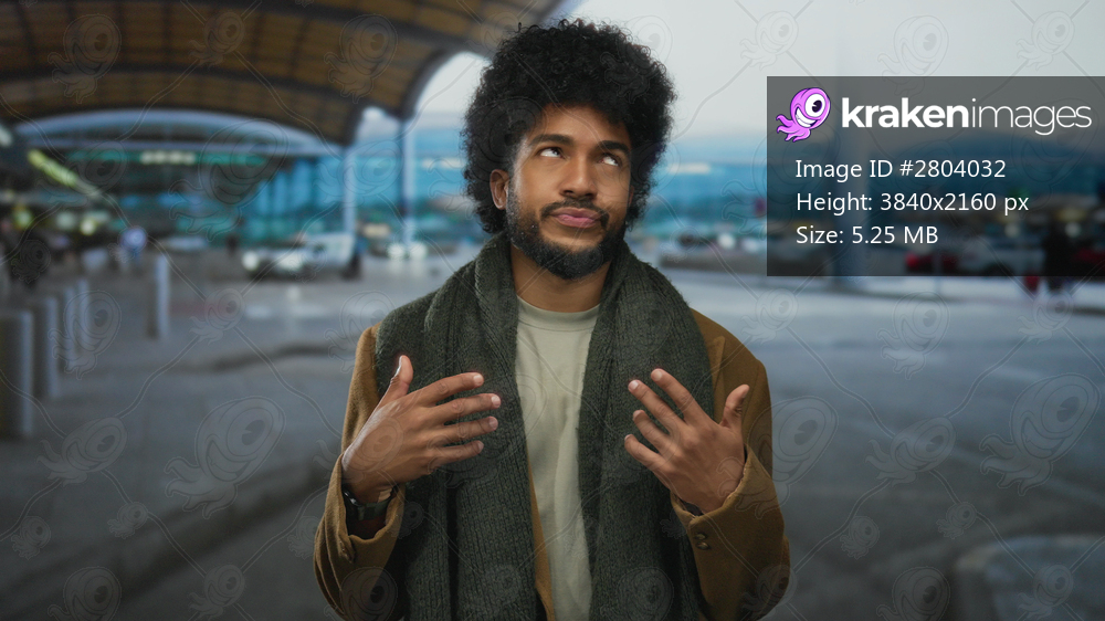African american man with beard standing outdoors at airport looking puzzled wearing a scarf and coat under the modern structured roof.