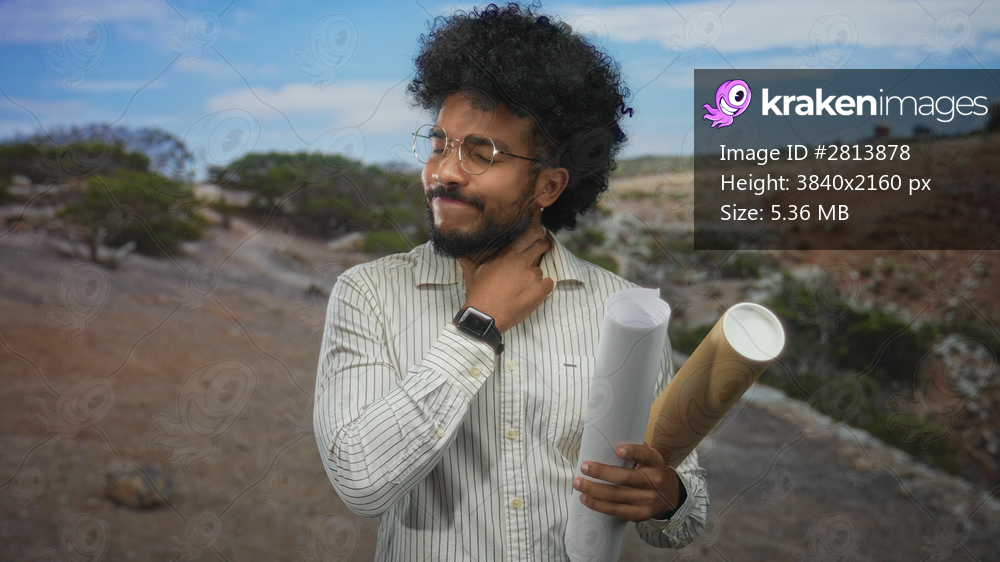 African american man with blueprints holding throat in pain at outdoor green park suggests discomfort or sore throat while working outside.