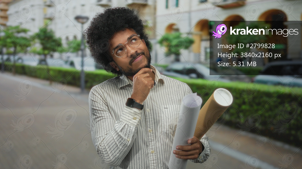 African american man with blueprints standing outdoors in a city street wearing glasses and striped shirt smiling thoughtfully.