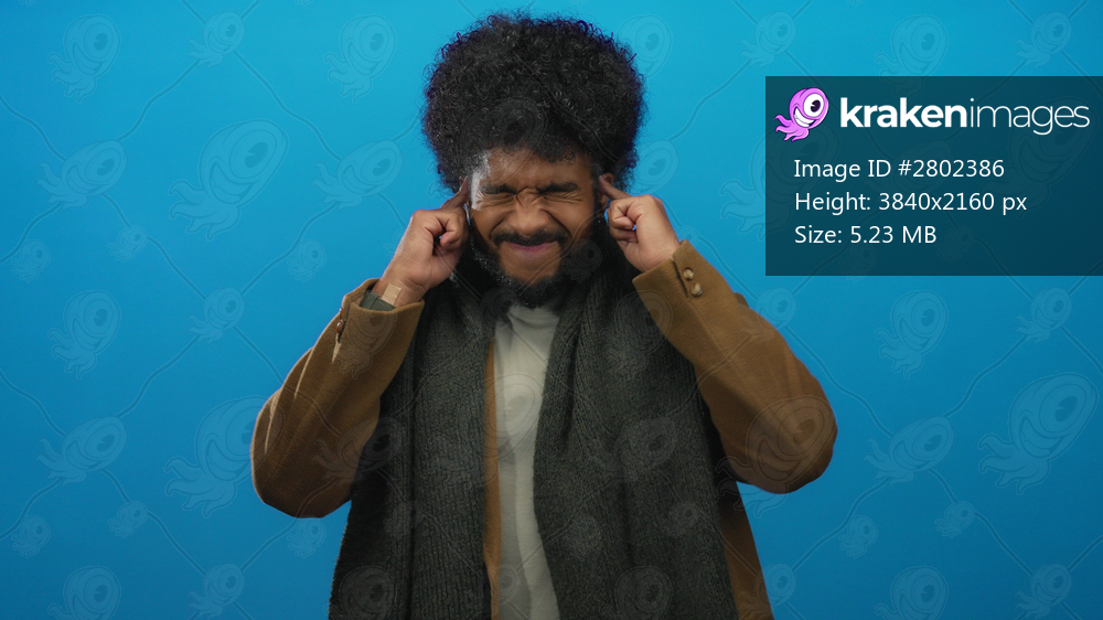 African american man with closed eyes and hands covering ears stands against a blue wall, expressing frustration while wearing a scarf and coat in an isolated setting. - Kraken Images