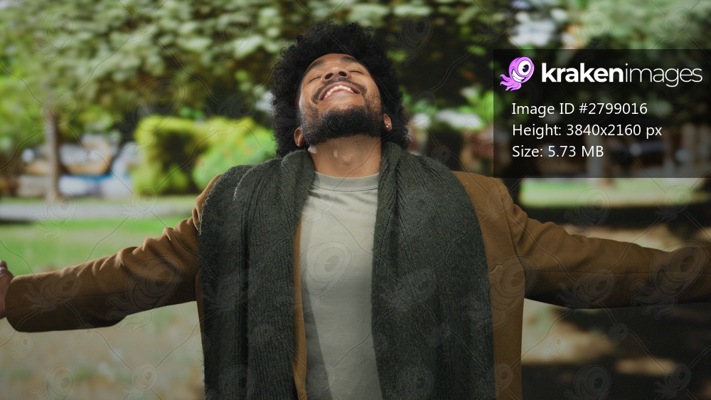 African american man enjoying freedom in a green park with arms outstretched and a joyful expression under sunny skies.