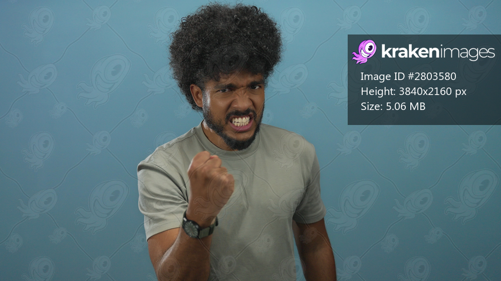 African american man expressing excitement with clenched fist against a vibrant blue isolated background, wearing casual attire and projecting determination and success. - Kraken Images