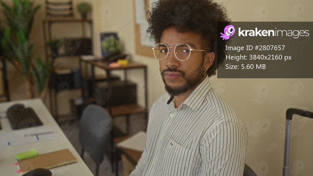 African american man with glasses in a modern office sitting by a table with plants, books, and a travel suitcase nearby, focused and professional.