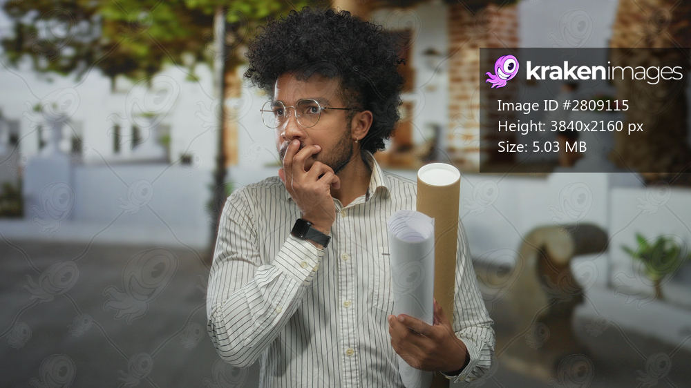 African american man holding blueprints on city street checks time looking at smartwatch.