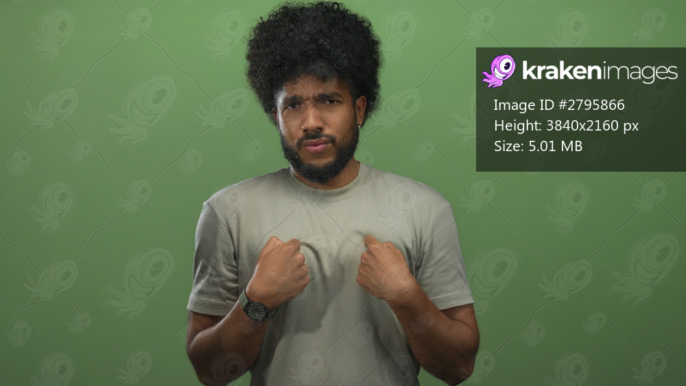 African american man in a gray shirt points to himself against a green wall background, expressing reaction and emotion with focus on his facial expression and gestures. - Kraken Images