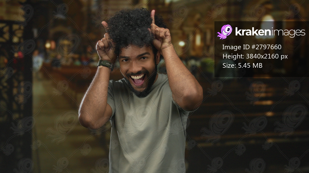 African american man in church making playful gesture with fingers on head, smiling widely in warmly lit interior with people and benches in the background. - Kraken Images