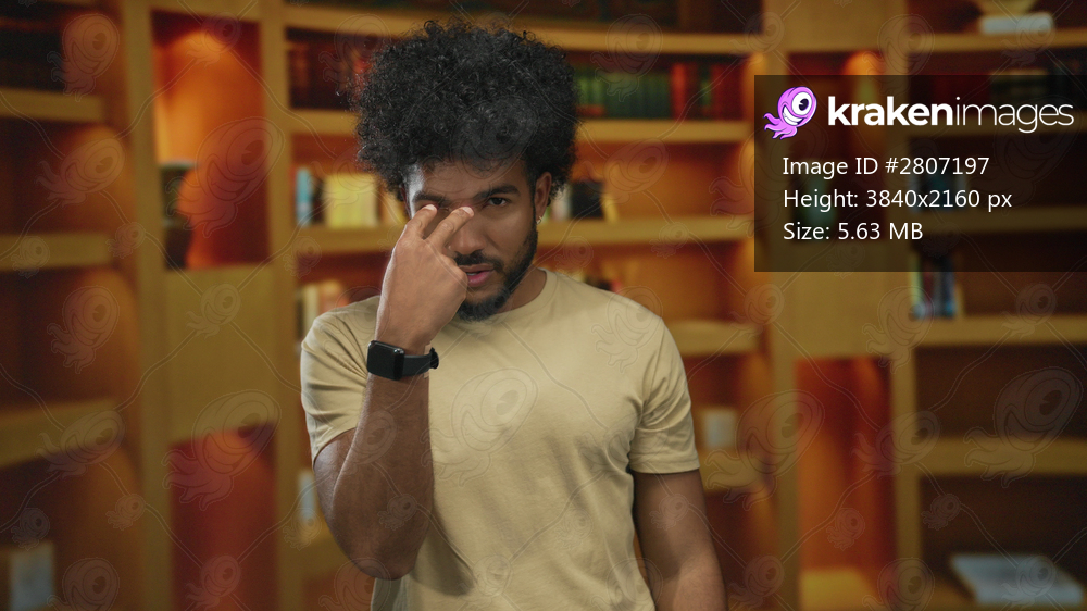 African american man in library making gesture with serious expression surrounded by bookshelves indoors.