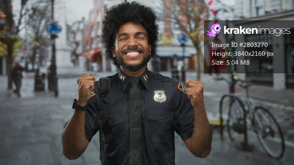 African american man in police uniform celebrating with fists raised on a city street surrounded by urban elements and bicycles, displaying joy and success. - Kraken Images