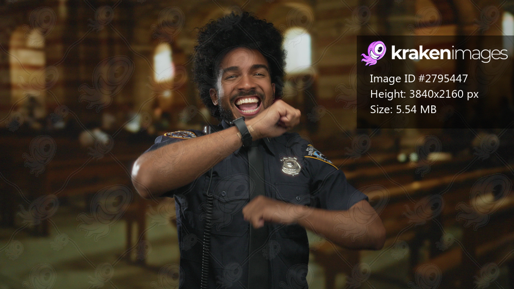 African american man in police uniform joyfully dances inside a church, capturing a moment of happiness and breaking stereotypes in a spiritual setting. - Kraken Images