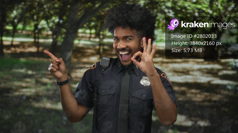 African american man in police uniform poses playfully in a sunny park with trees in the background, pointing and smiling, capturing a lighthearted outdoor moment. - Kraken Images