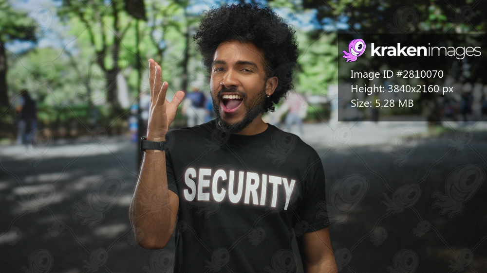 African american man in security uniform gestures delicious in a sunny park with vibrant green trees and blurred people walking in the background outdoors. - Kraken Images