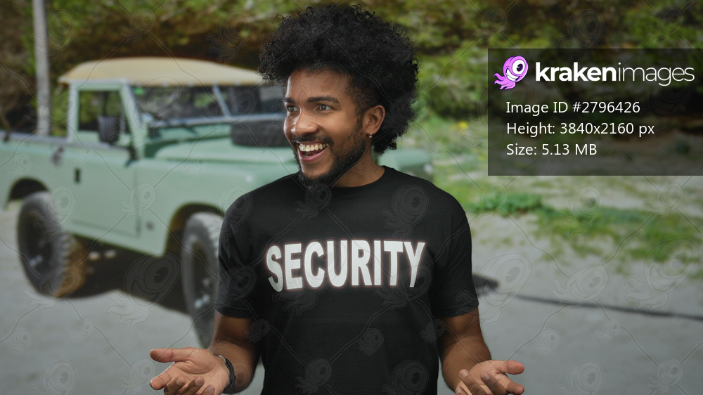 African american man in security uniform smiling in a green park with a vintage vehicle in the background, showcasing outdoor security theme.