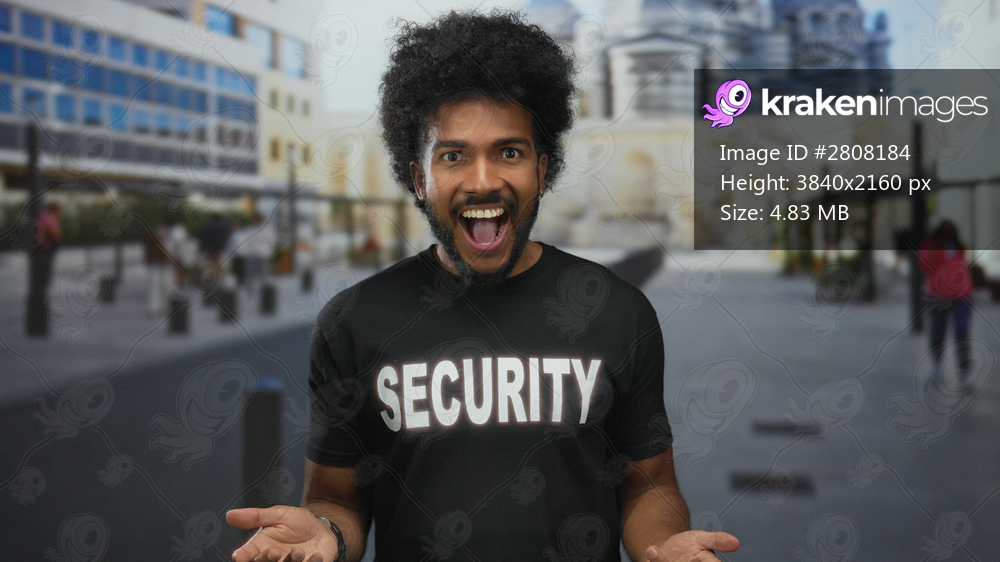 African american man in security uniform smiling outdoors on a busy city street with modern buildings in the background, conveying a cheerful urban atmosphere. - Kraken Images