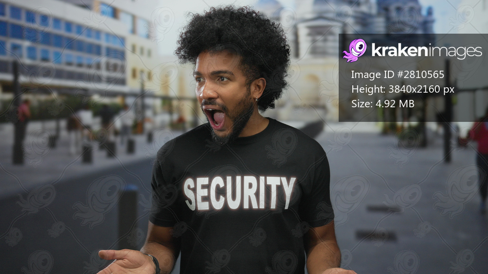 African american man in security uniform smiling outdoors on a busy city street with modern buildings in the background, conveying a cheerful urban atmosphere. - Kraken Images
