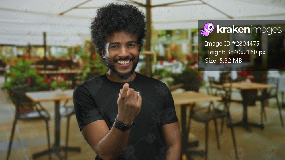African american man in staff uniform gesturing with finger on outdoor restaurant terrace with tables and flower pots.