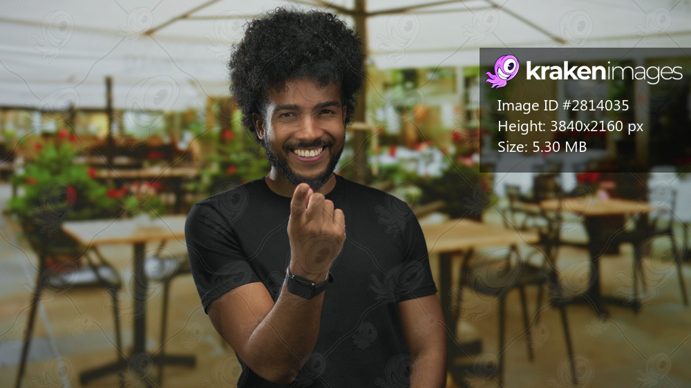 African american man in staff uniform gesturing with finger on outdoor restaurant terrace with tables and flower pots.