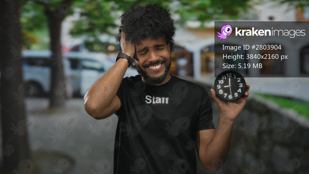 African american man in staff uniform holding clock on outdoor city street with trees and blurred cityscape background, expressing frustration.