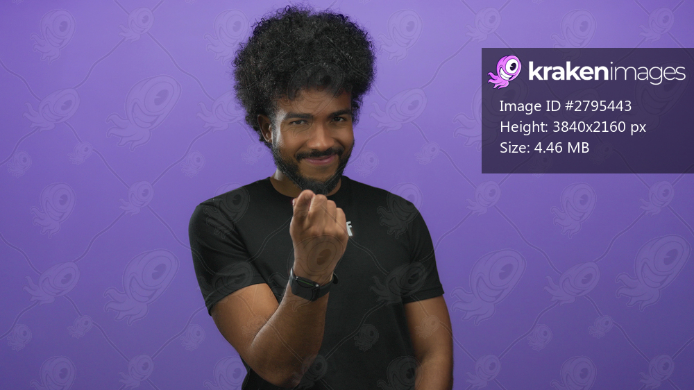 African american man in staff uniform makes beckoning gesture against isolated purple background