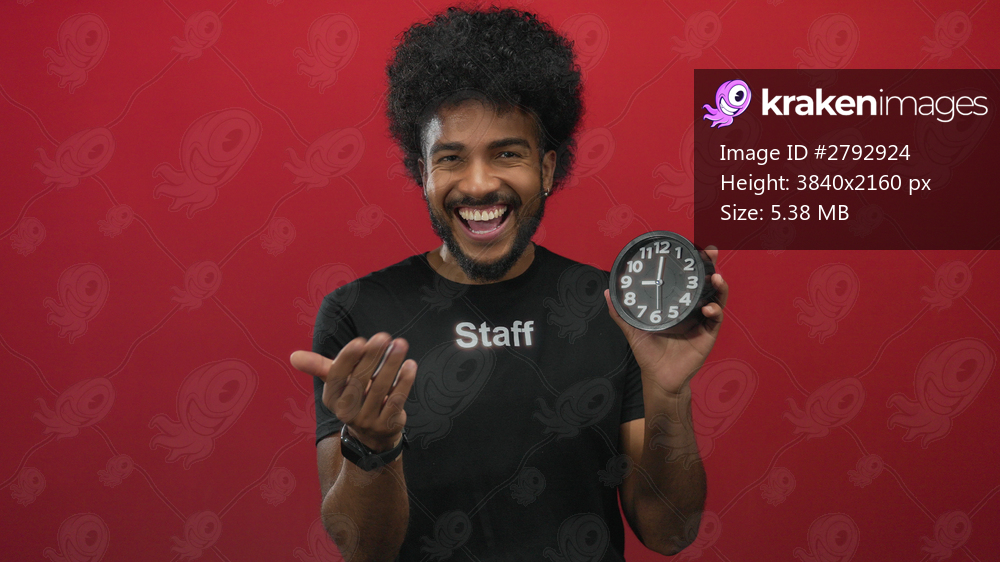 African american man in staff uniform smiles holding clock against vibrant red background, suggesting a focus on punctuality and professionalism.