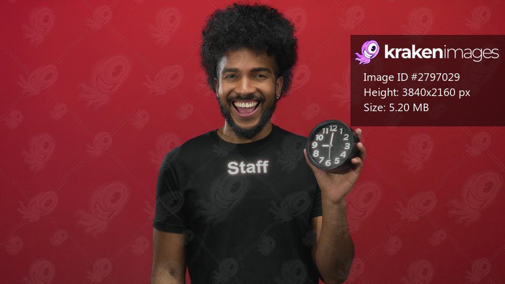 African american man in staff uniform smiles holding clock against vibrant red background, suggesting a focus on punctuality and professionalism.