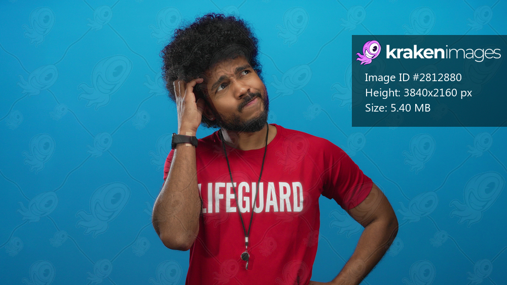 African american man lifeguard in red shirt pondering against blue background isolated indoors.