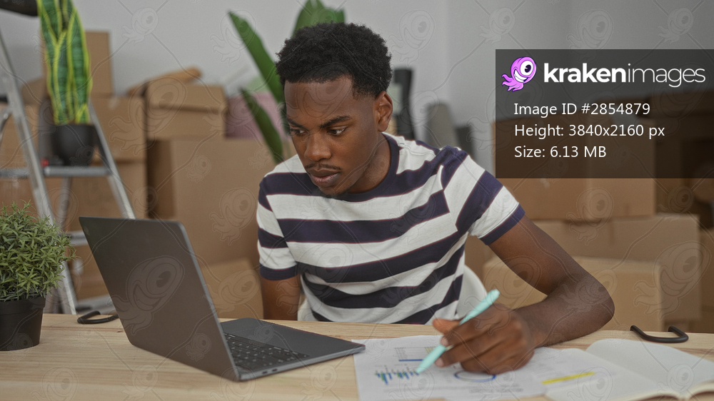 African american man seated at desk writing with pen next to laptop among moving boxes in building; focused determination.