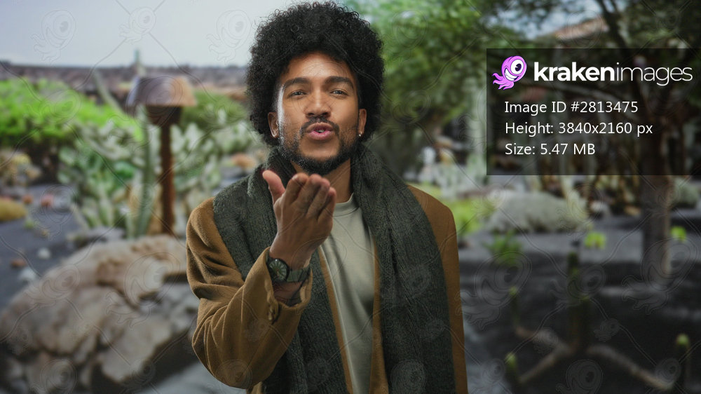 African american man smiling and blowing a kiss in a vibrant green outdoor park setting.