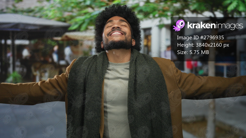 African american man smiling joyfully on a city street with arms outstretched in a relaxed outdoor setting.