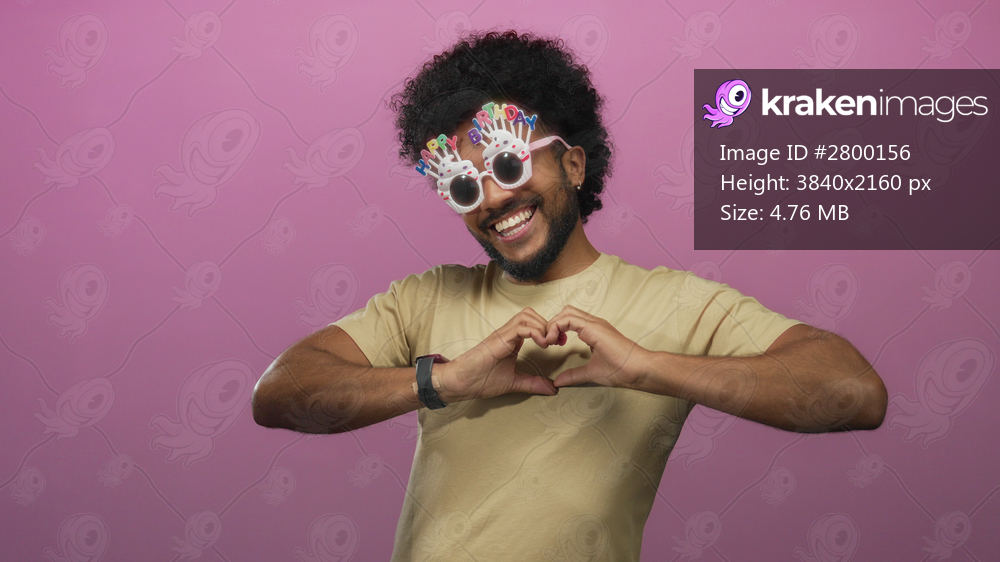 African american man smiling while wearing funny glasses with heart gesture on pink background captures joyful celebration.