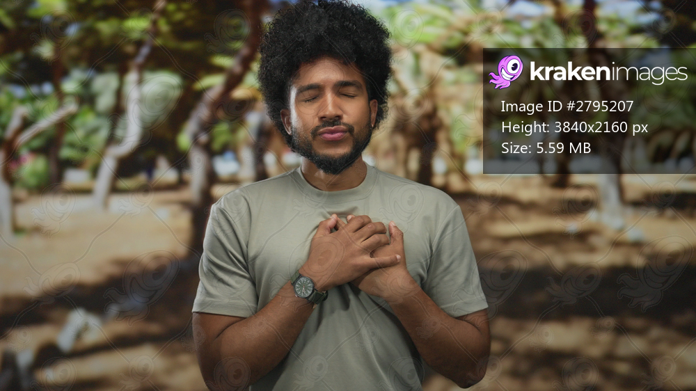 African american man standing in a park with trees, wearing a watch, expressing emotion in an outdoor setting filled with greenery under sunlight.