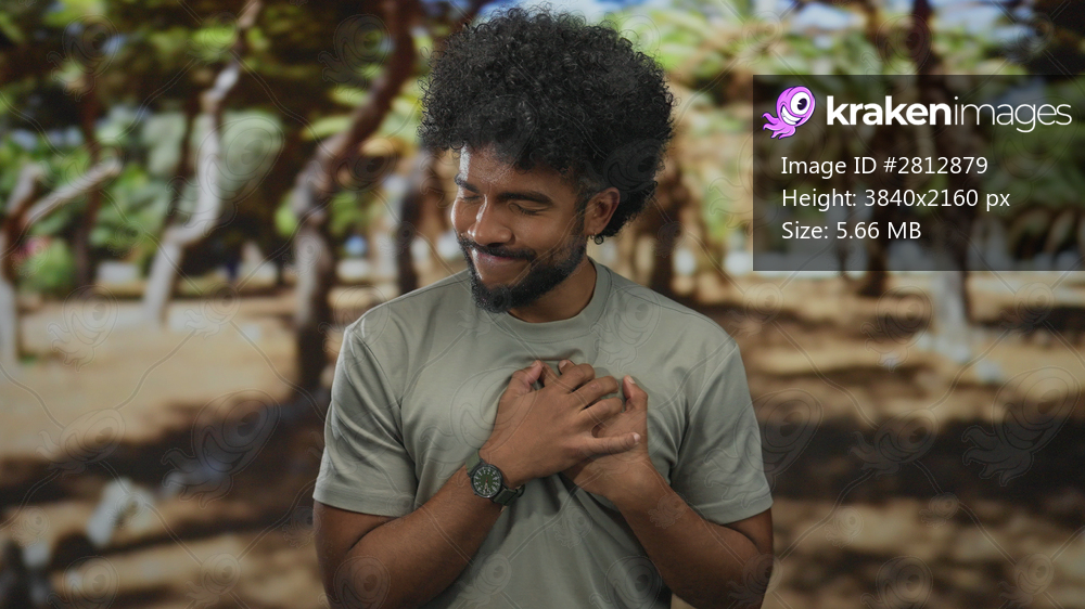 African american man standing in a park with trees, wearing a watch, expressing emotion in an outdoor setting filled with greenery under sunlight.