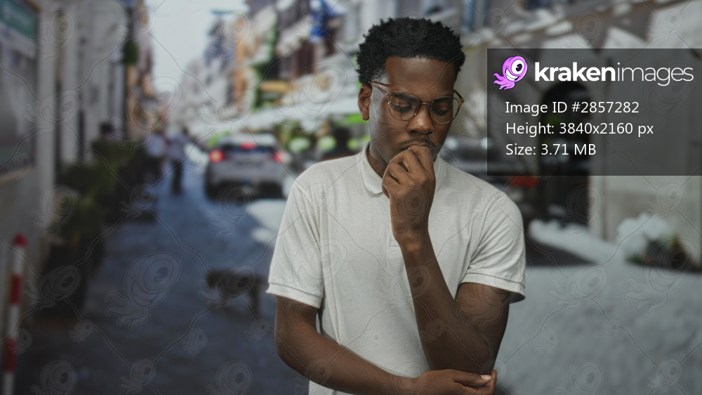 African american man wearing glasses and white polo with hand on chin on a city street; contemplation.