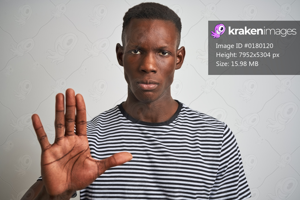 African american man wearing navy striped t-shirt standing over isolated white background with open hand doing stop sign with serious and confident expression, defense gesture - Kraken Images