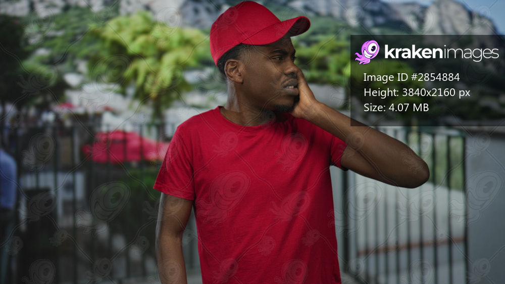 African american man wearing red cap and shirt pressing hand against ear for earache on urban street beside metal railing; discomfort.