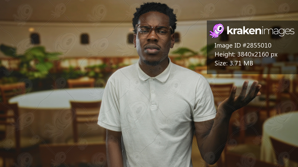 African american man wearing white polo shirt raising right hand gesture inside restaurant building; confusion.