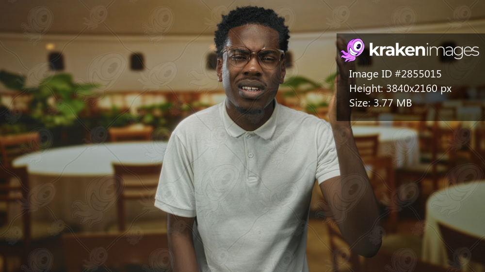 African american man wearing white polo shirt raising right hand gesture inside restaurant building; confusion.