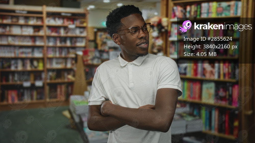 African american man wearing white polo shirt tilts head toward bookshelf in building; intellectual curiosity.