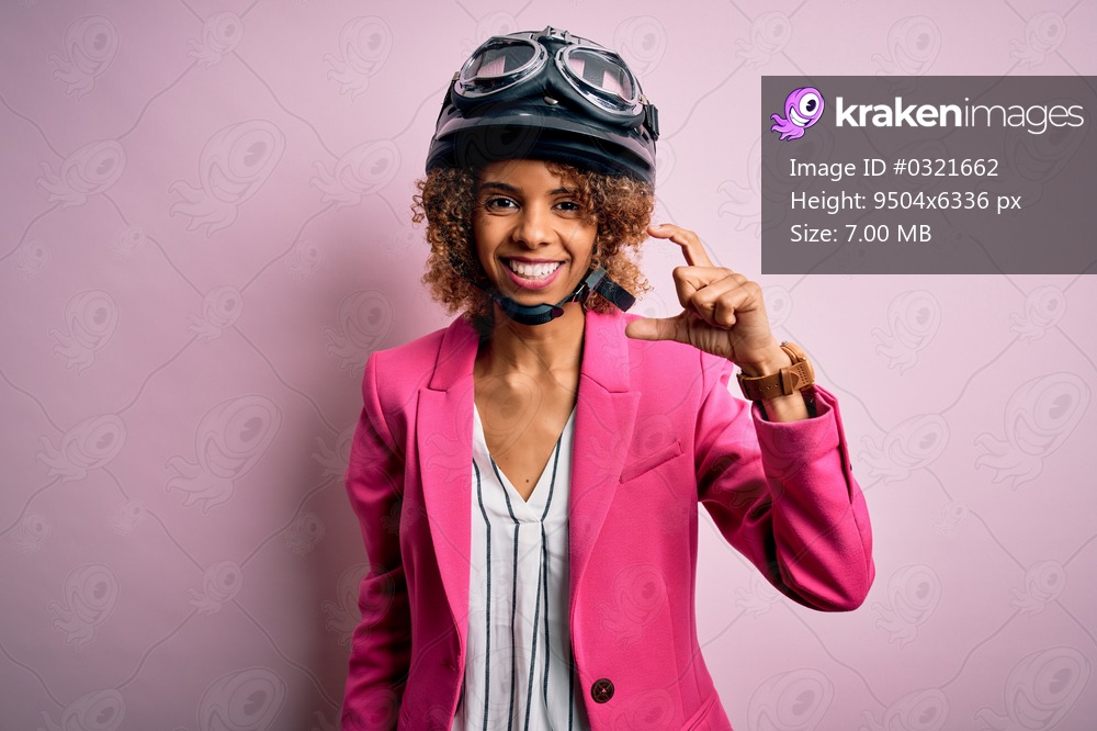 African american motorcyclist woman with curly hair wearing moto helmet over pink background smiling and confident gesturing with hand doing small size sign with fingers looking and the camera. Measure concept. - Kraken Images