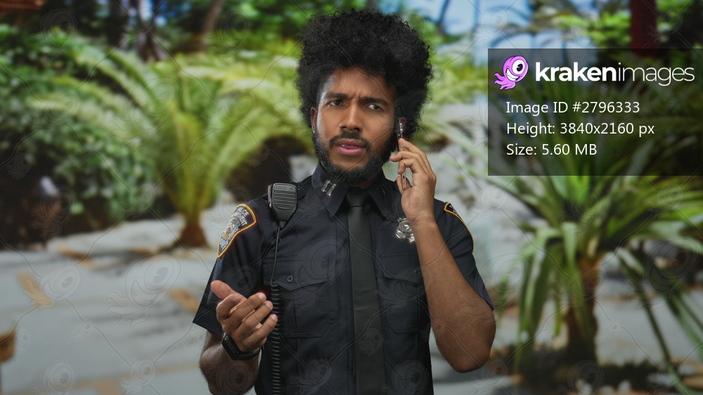 African american police man talking on smartphone in green outdoor park setting, wearing uniform with focus on communication and authority.